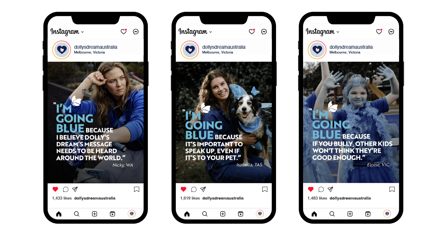 Our 2024 campaign for Dolly’s Dream builds on their reputation as the country’s leading anti-bullying charity, established via previous years’ campaigns. It rallies the country behind the powerful CTA to ‘Go Blue To End Bullying’, demonstrating how everyday Australians are undertaking heroic feats to help raise funds for Dolly’s Dream’s much needed anti-bullying programs.